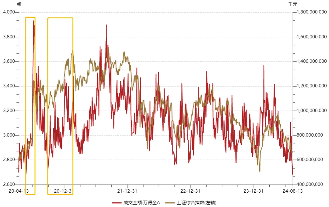 值得關注的是,2020年5月25日出現5000億內的地量后,A股快速反彈,上證指數由2800多點,快速上沖至3400多點,漲幅超過20%;