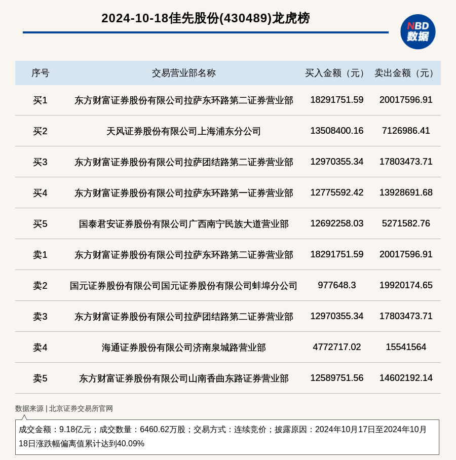 每經訊,2024年10月18日,北交所上市公司佳先股份(430489,收盤價:17.52元)登上龍虎榜,交易方式是連續競價,披露原因是2024年10月17日至2024年10月18日漲跌幅偏離值累計達到40.09%,成交數量6460.62萬股,成交金額9.18億元。買一席位為東方財富證券股份有限公司拉薩東環路第二證券營業部,買入1829.18萬元;賣一席位為東方財富證券股份有限公司拉薩東環路第二證券營業部,賣出2001.76萬元。