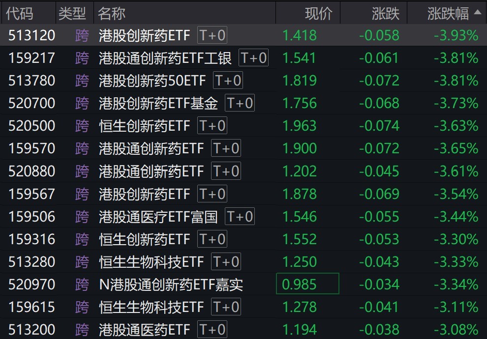 受盤面影響,多只港股創新藥相關ETF跌超3%。