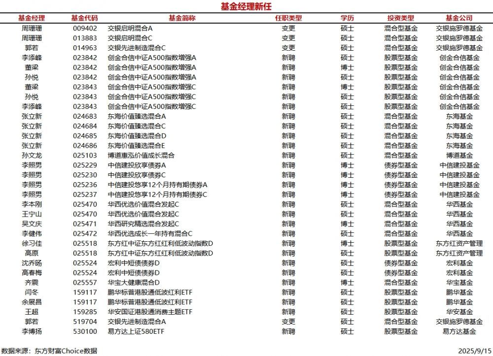 每經AI快訊,據東方財富Choice數據統計,今日新聘基金經理21人,涉及24只基金(A/C類分開計算),主要來自華西基金、東海基金等公司。