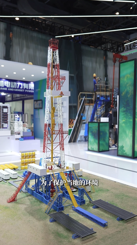 “人工智能+島式鉆井技術”智能鉆機、12000米深智鉆機、極地鉆機……在東方宏華展區,展出了應用于不同場景的鉆機模型,其中,一臺烏干達超靜音智能鉆機,成為展會“輕”實力的代表。該鉆機作業噪聲低于50分貝,如人低聲細語,實現與自然和諧共處。相比傳統鉆機節能30%以上,搭配三元催化排氣管,可減少90%以上的尾氣排放,真正做到生態保護與能源開采兩不誤。