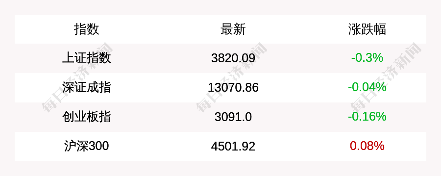 每經AI快訊:北京時間9月19日15:00,上證指數收盤下跌11.57點,跌幅為0.3%,報收3820.09點,成交額10163.48億元;深證成指收盤下跌4.8點,跌幅為0.04%,報收13070.86點,成交額13074.9億元;創業板指收盤下跌4.85點,跌幅為0.16%,報收3091.0點,成交額6036.56億元;滬深300收盤上漲3.81點,漲幅為0.08%,報收4501.92點,成交額6038.87億元。