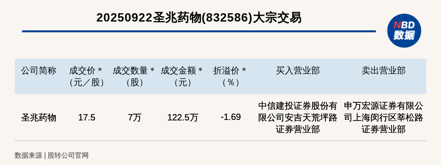 每經訊,2025年9月22日,新三板創新層公司圣兆藥物(832586,收盤價:17.8元)發生一筆大宗交易,成交價17.5元/股,成交數量7萬股,成交金額122.5萬元,折價1.69%。買入營業部是中信建投證券股份有限公司安吉天荒坪路證券營業部,賣出營業部是申萬宏源證券有限公司上海閔行區莘松路證券營業部。
