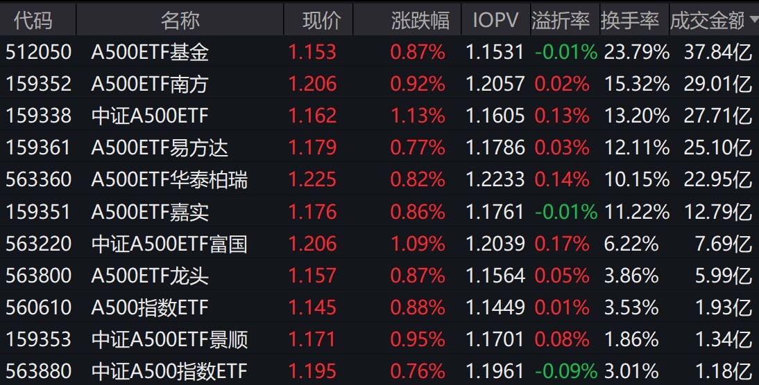 截至上午收盤,場內跟蹤中證A500指數的ETF漲約1%。其中,有11只中證A500相關ETF成交額超1億元,3只超27億元。A500ETF基金、A500ETF南方、中證A500ETF早盤成交額分別為37.84億元、29.01億元、27.71億元。