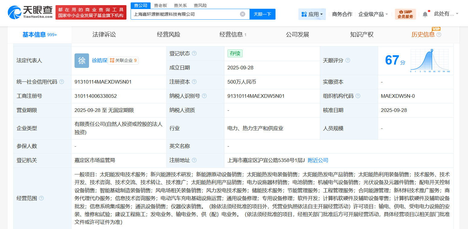 每經AI快訊,天眼查App顯示,近日,上海嘉軒源新能源科技有限公司成立,法定代表人為徐皓琛,注冊資本500萬元人民幣,經營范圍含太陽能發電技術服務、新興能源技術研發、新能源原動設備銷售、太陽能熱發電裝備銷售、太陽能熱發電產品銷售、太陽能熱利用裝備銷售、太陽能熱利用產品銷售、電力設施器材銷售、電池銷售等。股權全景穿透圖顯示,該公司由上海國軒數字能源科技有限公司全資持股,后者為國軒控股集團有限公司全資子公司。