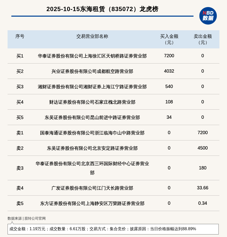 每經訊,2025年10月15日,新三板基礎層公司東海租賃(835072,收盤價:0.18元)登上龍虎榜,交易方式是集合競價,披露原因是當日價格振幅達到88.89%,成交數量6.61萬股,成交金額1.19萬元。買一席位為華泰證券股份有限公司上海徐匯區天鑰橋路證券營業部,買入7200元;賣一席位為國泰海通證券股份有限公司浙江臨海巾山中路營業部,賣出7200元。