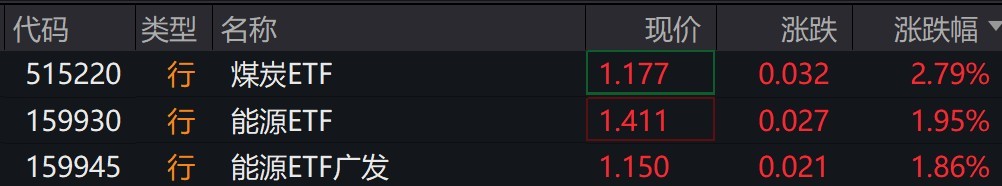 受盤面影響,煤炭ETF漲近3%,能源ETF漲近2%。