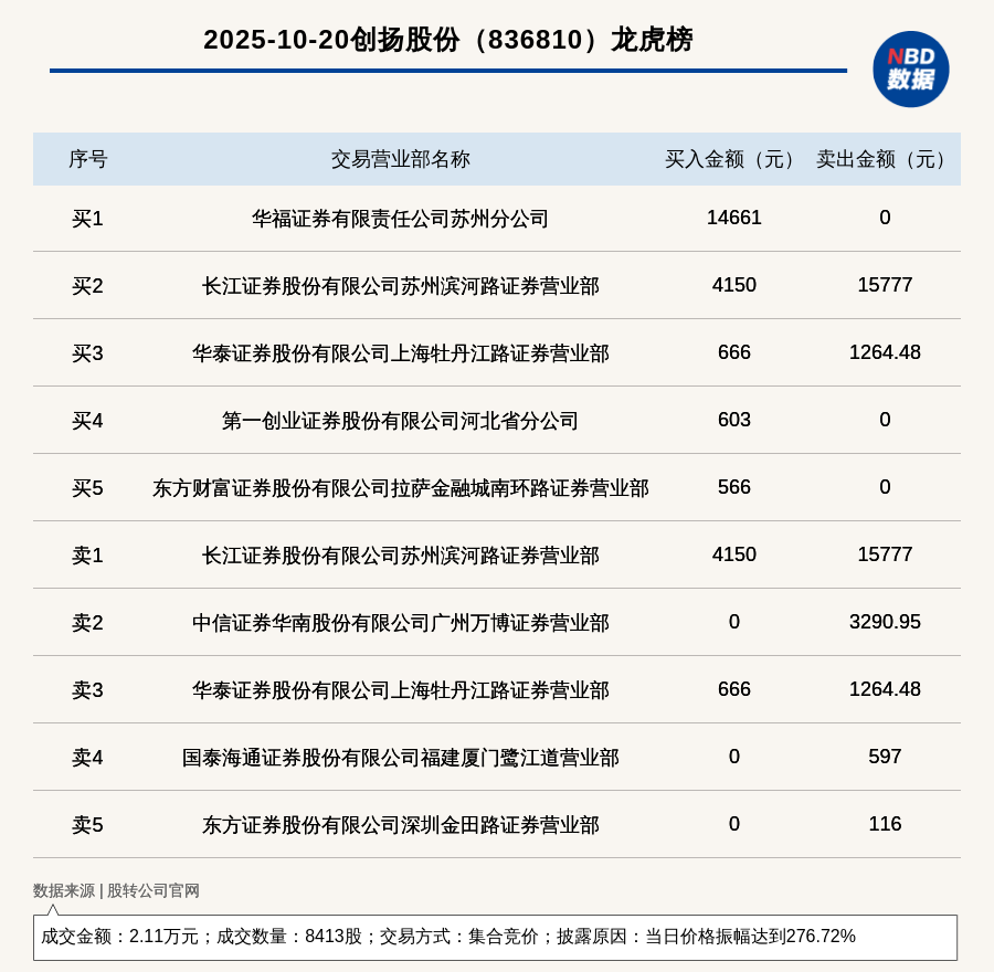 每經訊,2025年10月20日,新三板創新層公司創揚股份(836810,收盤價:3元)登上龍虎榜,交易方式是集合競價,披露原因是當日價格振幅達到276.72%,成交數量8413股,成交金額2.11萬元。買一席位為華福證券有限責任公司蘇州分公司,買入1.47萬元;賣一席位為長江證券股份有限公司蘇州濱河路證券營業部,賣出1.58萬元。