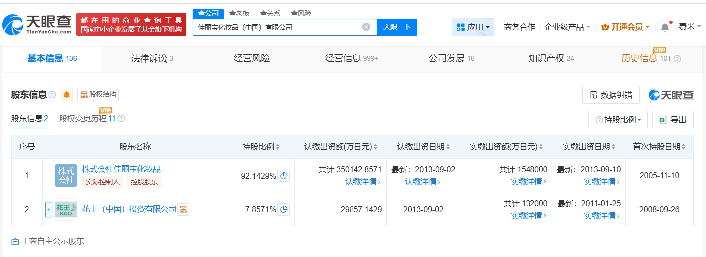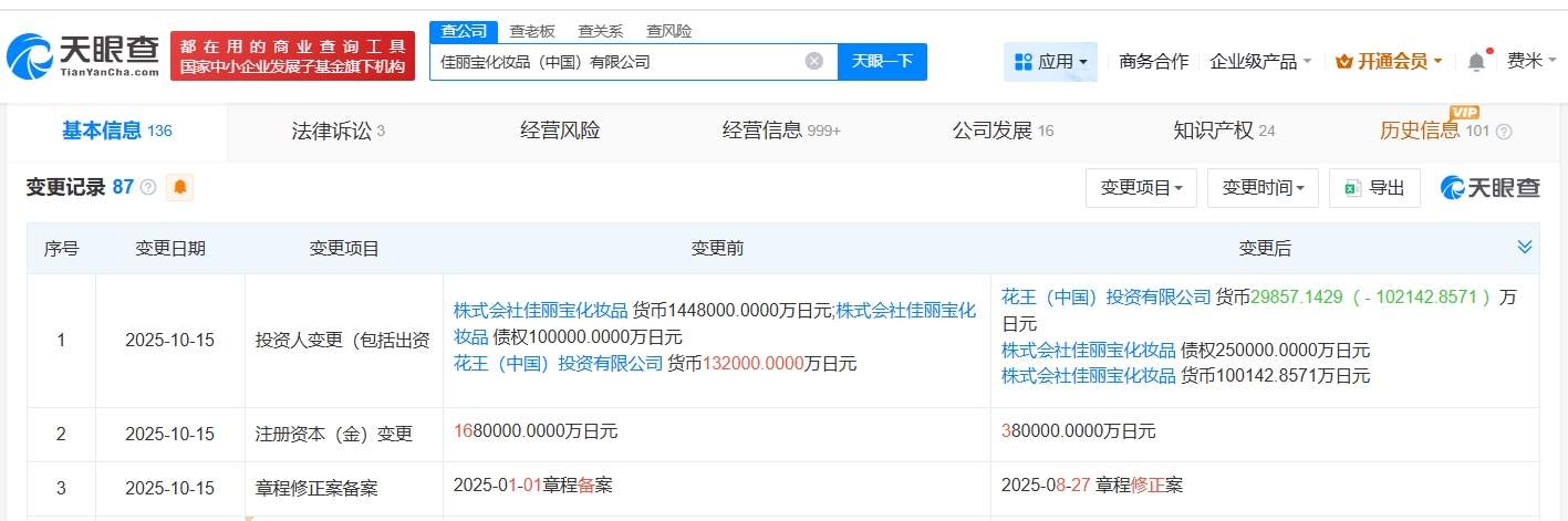 每經AI快訊,天眼查App顯示,近日,佳麗寶化妝品(中國)有限公司發生工商變更,注冊資本由168億日元減至38億日元,降幅約77%。佳麗寶化妝品(中國)有限公司成立于2005年11月,法定代表人為竹安將(TAKEYASUMASARU),經營范圍包括互聯網銷售、傭金代理、美容及相關咨詢服務等。股東信息顯示,該公司由株式會社佳麗寶化妝品、花王(中國)投資有限公司共同持股。