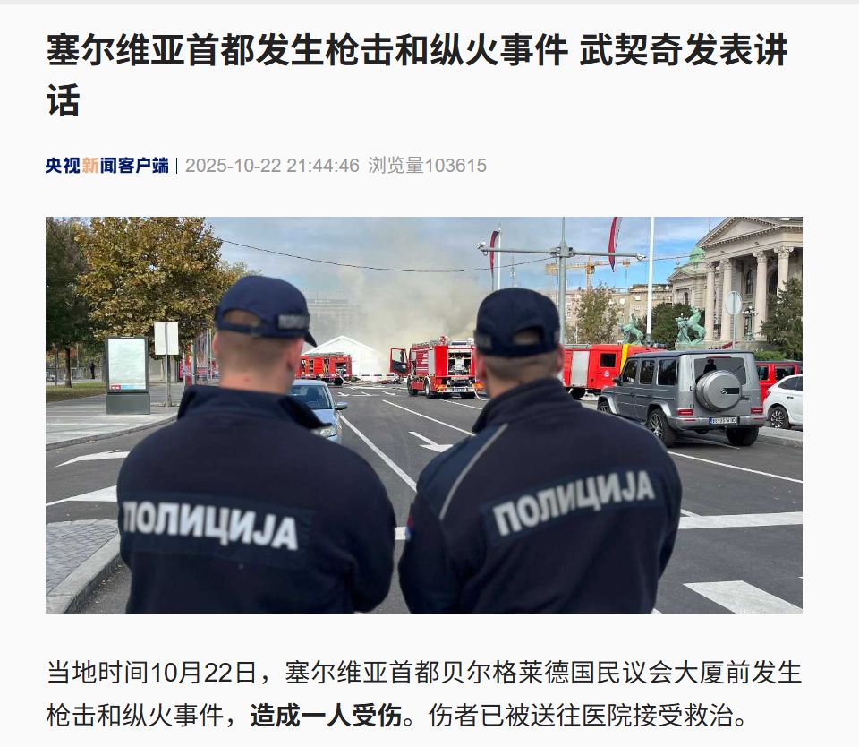 塞爾維亞首都貝爾格萊德國民議會大廈門前22日發生槍擊和縱火事件,造成1人重傷。塞總統武契奇稱此為恐怖襲擊。襲擊者向議會大廈前搭設帳篷的民眾開槍并縱火,這些民眾反對全國封鎖。襲擊者顯然經過訓練,火勢現已被控制,警方逮捕了一名男性嫌疑人。武契奇因此提前離開活動,案件正在進一步調查中。