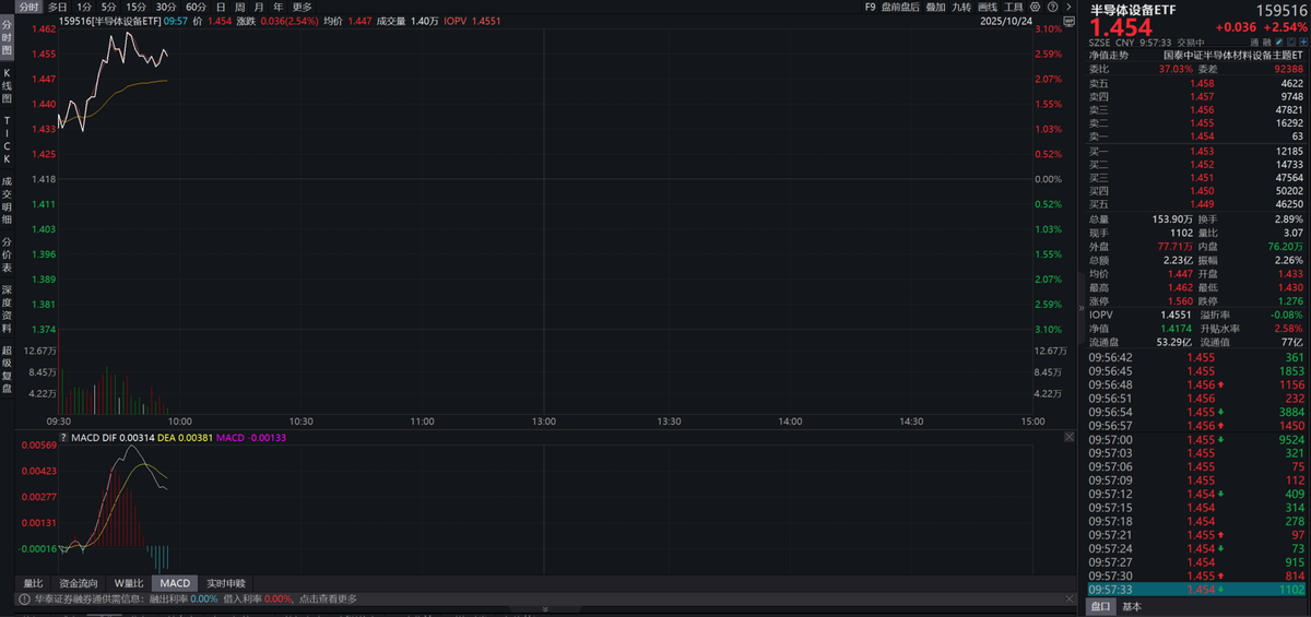 10月24日,在前期調整后,聚焦上游最卡脖子的半導體設備領域的半導體設備ETF(159516)今日迎來反彈,盤中漲超2.5%。資金持續搶籌,半導體設備ETF(159516)年初以來份額增長超200%,當前規模超75億元,居同類產品第一。