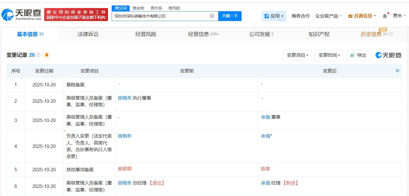 每經AI快訊,天眼查App顯示,近日,深圳市深科裝備技術有限公司發生工商變更,陳勉冬卸任法定代表人、執行董事、總經理,由余海接任法定代表人,并擔任董事、經理。深圳市深科裝備技術有限公司成立于2022年2月,注冊資本約15億元,經營范圍包括智能基礎制造裝備銷售、半導體器件專用設備銷售、電子專用設備銷售等。股權全景穿透圖顯示,該公司由新凱來旗下深圳市新凱來工業機器有限公司全資持股。