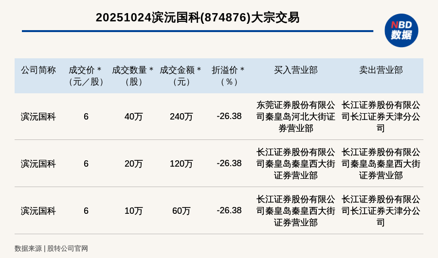 每經訊,2025年10月24日,新三板基礎層公司濱沅國科(874876,收盤價:8.15元)發生3筆大宗交易,總成交金額為420萬元,成交金額最高的一筆成交價6元/股,成交數量40萬股,成交金額240萬元,折價26.38%。買入營業部是東莞證券股份有限公司秦皇島河北大街證券營業部,賣出營業部是長江證券股份有限公司長江證券天津分公司。