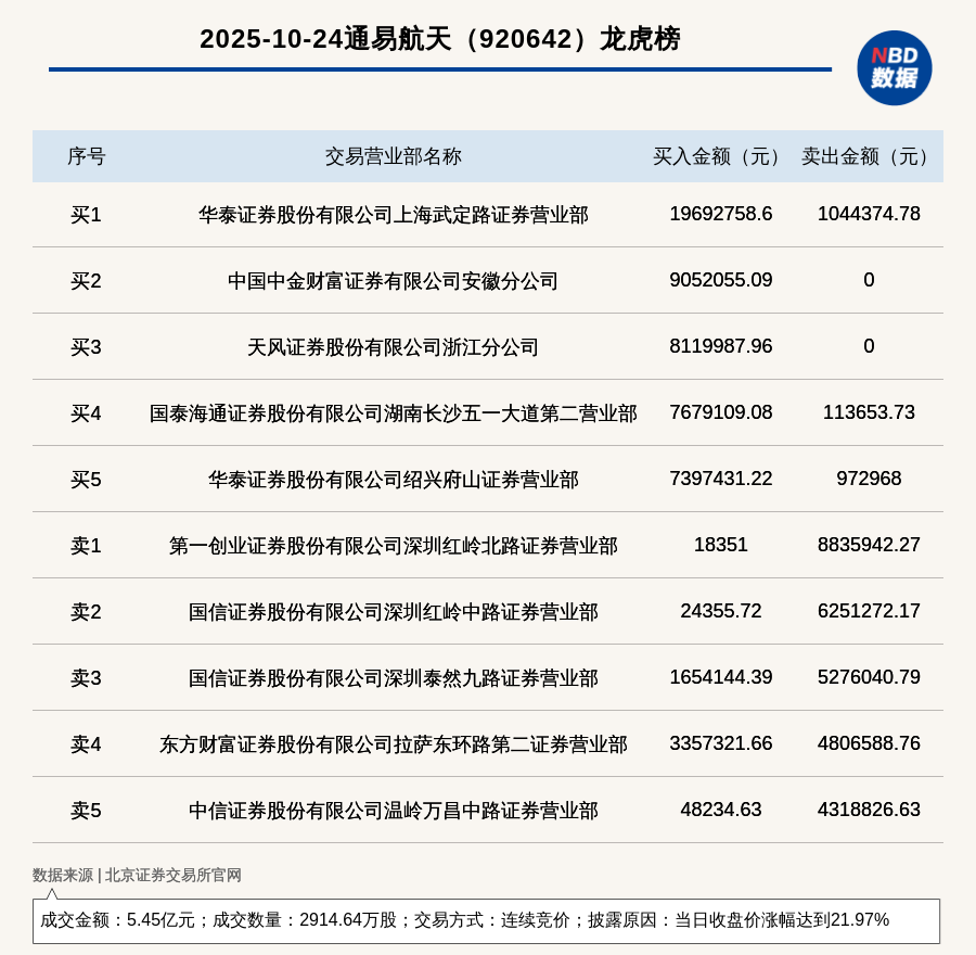 每經訊,2025年10月24日,北交所上市公司通易航天(920642,收盤價:18.1元)登上龍虎榜,交易方式是連續競價,披露原因是當日收盤價漲幅達到21.97%,成交數量2914.64萬股,成交金額5.45億元。買一席位為華泰證券股份有限公司上海武定路證券營業部,買入1969.28萬元;賣一席位為第一創業證券股份有限公司深圳紅嶺北路證券營業部,賣出883.59萬元。
