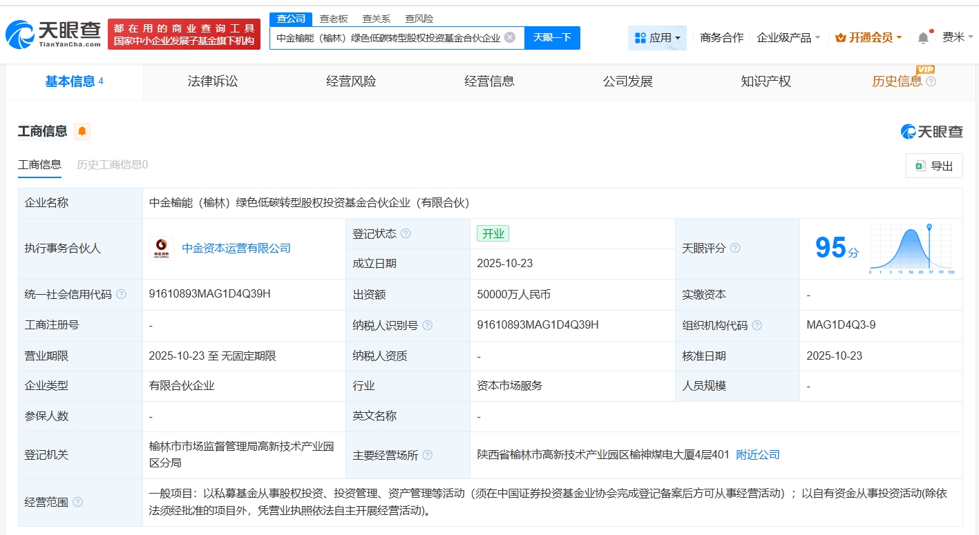 每經AI快訊,天眼查App顯示,近日,中金榆能(榆林)綠色低碳轉型股權投資基金合伙企業(有限合伙)成立,執行事務合伙人為中金資本運營有限公司,出資額5億元,經營范圍為以私募基金從事股權投資、投資管理、資產管理等活動,以自有資金從事投資活動,由陜西榆林能源集團有限公司、中金資本運營有限公司共同出資。