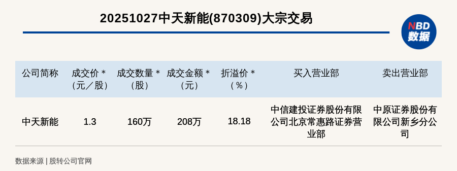 每經訊,2025年10月27日,新三板創新層公司中天新能(870309,收盤價:1.1元)發生一筆大宗交易,成交價1.3元/股,成交數量160萬股,成交金額208萬元,溢價18.18%。買入營業部是中信建投證券股份有限公司北京常惠路證券營業部,賣出營業部是中原證券股份有限公司新鄉分公司。