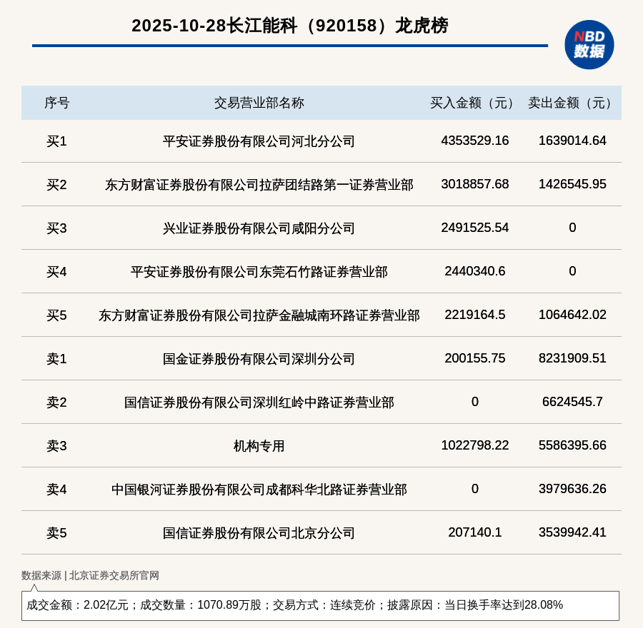 每經訊,2025年10月28日,北交所上市公司長江能科(920158,收盤價:18.49元)登上龍虎榜,交易方式是連續競價,披露原因是當日換手率達到28.08%,成交數量1070.89萬股,成交金額2.02億元。買一席位為平安證券股份有限公司河北分公司,買入435.35萬元;賣一席位為國金證券股份有限公司深圳分公司,賣出823.19萬元。