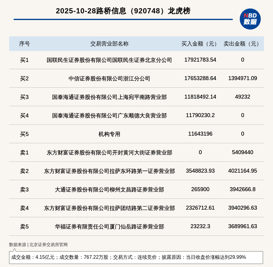 每經訊,2025年10月28日,北交所上市公司路橋信息(920748,收盤價:59.77元)登上龍虎榜,交易方式是連續競價,披露原因是當日收盤價漲幅達到29.99%,成交數量767.22萬股,成交金額4.15億元。買一席位為國聯民生證券股份有限公司國聯民生證券北京分公司,買入1792.18萬元;賣一席位為東方財富證券股份有限公司開封黃河大街證券營業部,賣出540.94萬元。