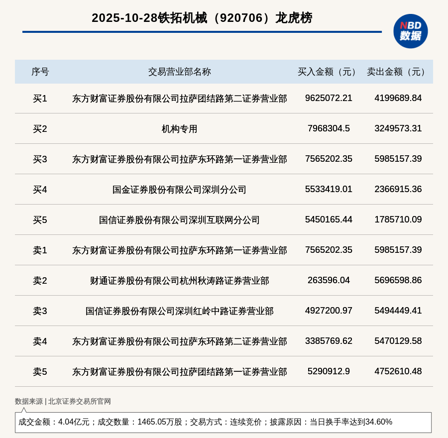 每經訊,2025年10月28日,北交所上市公司鐵拓機械(920706,收盤價:28.37元)登上龍虎榜,交易方式是連續競價,披露原因是當日換手率達到34.60%,成交數量1465.05萬股,成交金額4.04億元。買一席位為東方財富證券股份有限公司拉薩團結路第二證券營業部,買入962.51萬元;賣一席位為東方財富證券股份有限公司拉薩東環路第一證券營業部,賣出598.52萬元。