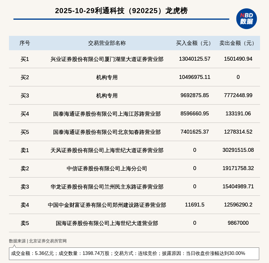 每經訊,2025年10月29日,北交所上市公司利通科技(920225,收盤價:42.9元)登上龍虎榜,交易方式是連續競價,披露原因是當日收盤價漲幅達到30.00%,成交數量1398.74萬股,成交金額5.36億元。買一席位為興業證券股份有限公司廈門湖里大道證券營業部,買入1304.01萬元;賣一席位為天風證券股份有限公司上海世紀大道證券營業部,賣出3029.15萬元。