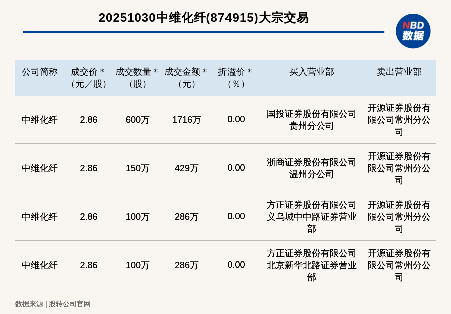 每經訊,2025年10月30日,新三板基礎層公司中維化纖(874915,收盤價:2.86元)發生4筆大宗交易,總成交金額為2717萬元,成交金額最高的一筆成交價2.86元/股,成交數量600萬股,成交金額1716萬元,為平價交易。買入營業部是國投證券股份有限公司貴州分公司,賣出營業部是開源證券股份有限公司常州分公司。