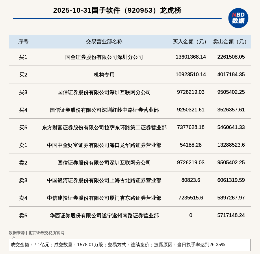 每經訊,2025年10月31日,北交所上市公司國子軟件(920953,收盤價:44.7元)登上龍虎榜,交易方式是連續競價,披露原因是當日換手率達到26.35%,成交數量1578.01萬股,成交金額7.1億元。買一席位為國金證券股份有限公司深圳分公司,買入1360.14萬元;賣一席位為中國中金財富證券有限公司海口龍華路證券營業部,賣出1328.85萬元。