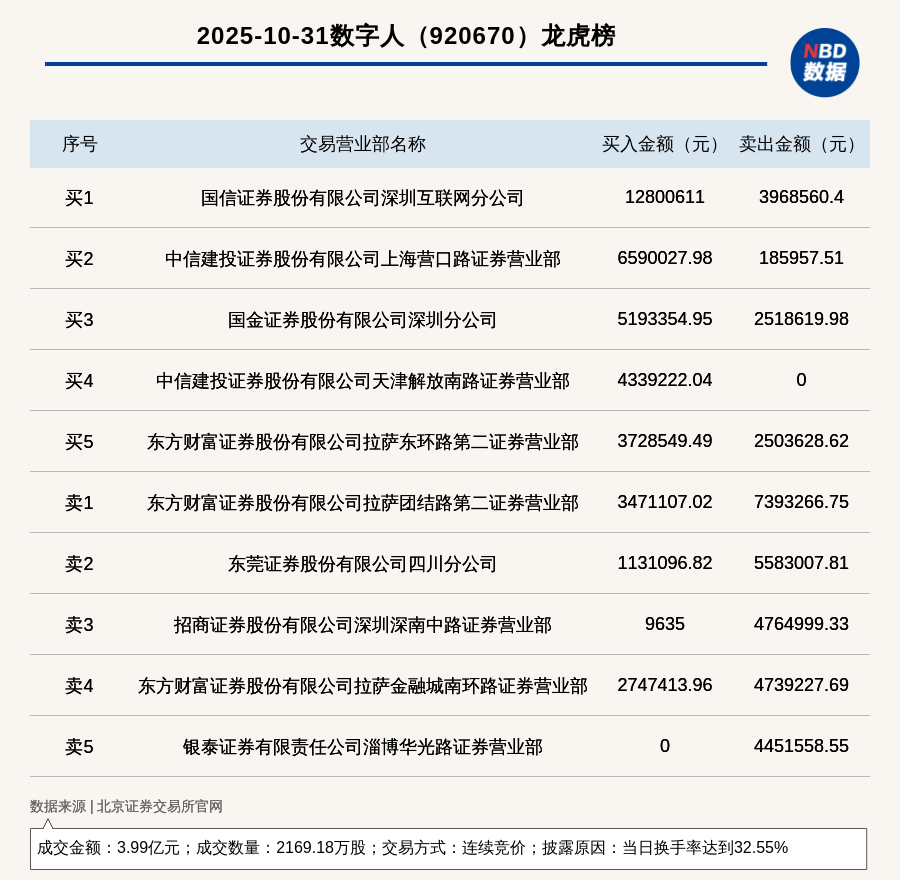 每經訊,2025年10月31日,北交所上市公司數字人(920670,收盤價:18.87元)登上龍虎榜,交易方式是連續競價,披露原因是當日換手率達到32.55%,成交數量2169.18萬股,成交金額3.99億元。買一席位為國信證券股份有限公司深圳互聯網分公司,買入1280.06萬元;賣一席位為東方財富證券股份有限公司拉薩團結路第二證券營業部,賣出739.33萬元。