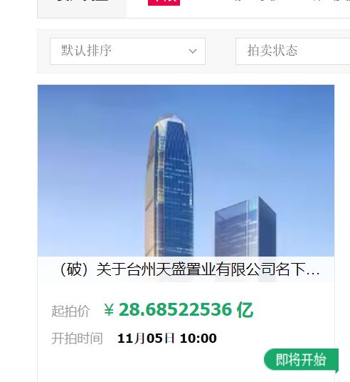 據阿里資產·司法拍賣平臺,浙江臺州天盛置業有限公司名下位于浙江省臺州市的相關資產,將于11月5日被拍賣。據拍賣平臺信息,本次被拍資產為天盛公司名下“天盛中心”“購物公園”土地使用權、在建工程、辦公設備、應收賬款等,起拍價約28.685億元。