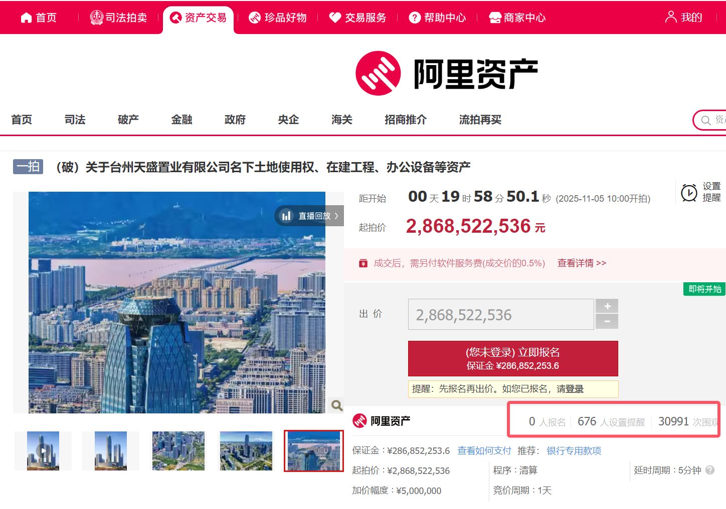 阿里資產·司法拍賣平臺顯示,浙江臺州天盛置業相關資產將于11月5日拍賣,起拍價約28.685億元。被拍資產包括“天盛中心”“購物公園”土地使用權等。其中,天盛中心為臺州“第一高樓”,項目雖已結頂但未驗收。拍賣平臺提示,提交100萬元盡調保證金后可了解詳細信息,競買人需注意時間要求,悔拍保證金不予退還。