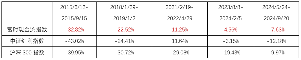 歷次市場大跌期間,現金流指數相對大盤更抗跌