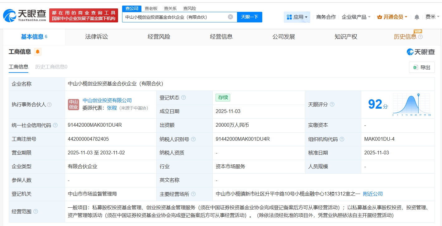 每經AI快訊,天眼查工商信息顯示,近日,中山小欖創業投資基金合伙企業(有限合伙)成立,執行事務合伙人為中山創業投資有限公司,出資額2億元人民幣,經營范圍為私募股權投資基金管理、創業投資基金管理服務,以私募基金從事股權投資、投資管理、資產管理等活動。合伙人信息顯示,該基金由中山創業投資有限公司、中山市產業投資母基金(有限合伙)、中山市長盛投資有限公司、中山市聯成投資有限公司共同出資。
