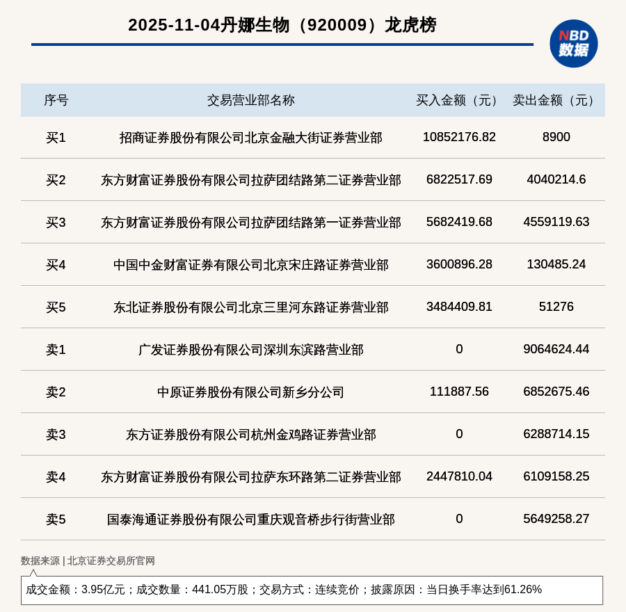 每經訊,2025年11月4日,北交所上市公司丹娜生物(920009,收盤價:85元)登上龍虎榜,交易方式是連續競價,披露原因是當日換手率達到61.26%,成交數量441.05萬股,成交金額3.95億元。買一席位為招商證券股份有限公司北京金融大街證券營業部,買入1085.22萬元;賣一席位為廣發證券股份有限公司深圳東濱路營業部,賣出906.46萬元。