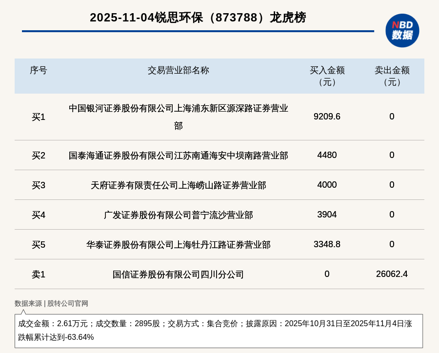 每經訊,2025年11月4日,新三板創新層公司銳思環保(873788,收盤價:8元)登上龍虎榜,交易方式是集合競價,披露原因是2025年10月31日至2025年11月4日漲跌幅累計達到-63.64%,成交數量2895股,成交金額2.61萬元。買一席位為中國銀河證券股份有限公司上海浦東新區源深路證券營業部,買入9209.6元;賣一席位為國信證券股份有限公司四川分公司,賣出2.61萬元。