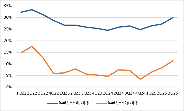 【半導體整體】2025Q3實現營業收入1570.74億元,yoy-1.5%;凈利潤177.73億元,yoy+56.9%。2025Q3銷售毛利率/銷售凈利率分別為29.97%/11.32%,分別yoy+3.60pct/+4.10pct。半導體板塊受益芯片設計、制造、設備等多個細分下游共振,產業鏈同步成長,有興趣的投資者可關注全產業鏈布局的芯片ETF(512760)。