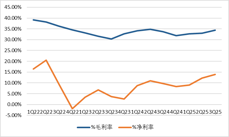 2025Q3銷售毛利率/銷售凈利率分別為34.34%/13.91%,分別yoy+0.61pct/+4.20pct。