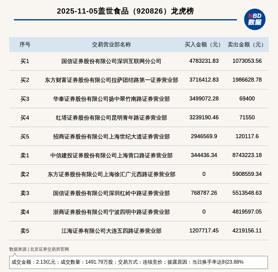 每經訊,2025年11月5日,北交所上市公司蓋世食品(920826,收盤價:14.12元)登上龍虎榜,交易方式是連續競價,披露原因是當日換手率達到23.88%,成交數量1491.79萬股,成交金額2.13億元。買一席位為國信證券股份有限公司深圳互聯網分公司,買入478.32萬元;賣一席位為中信建投證券股份有限公司上海營口路證券營業部,賣出874.32萬元。