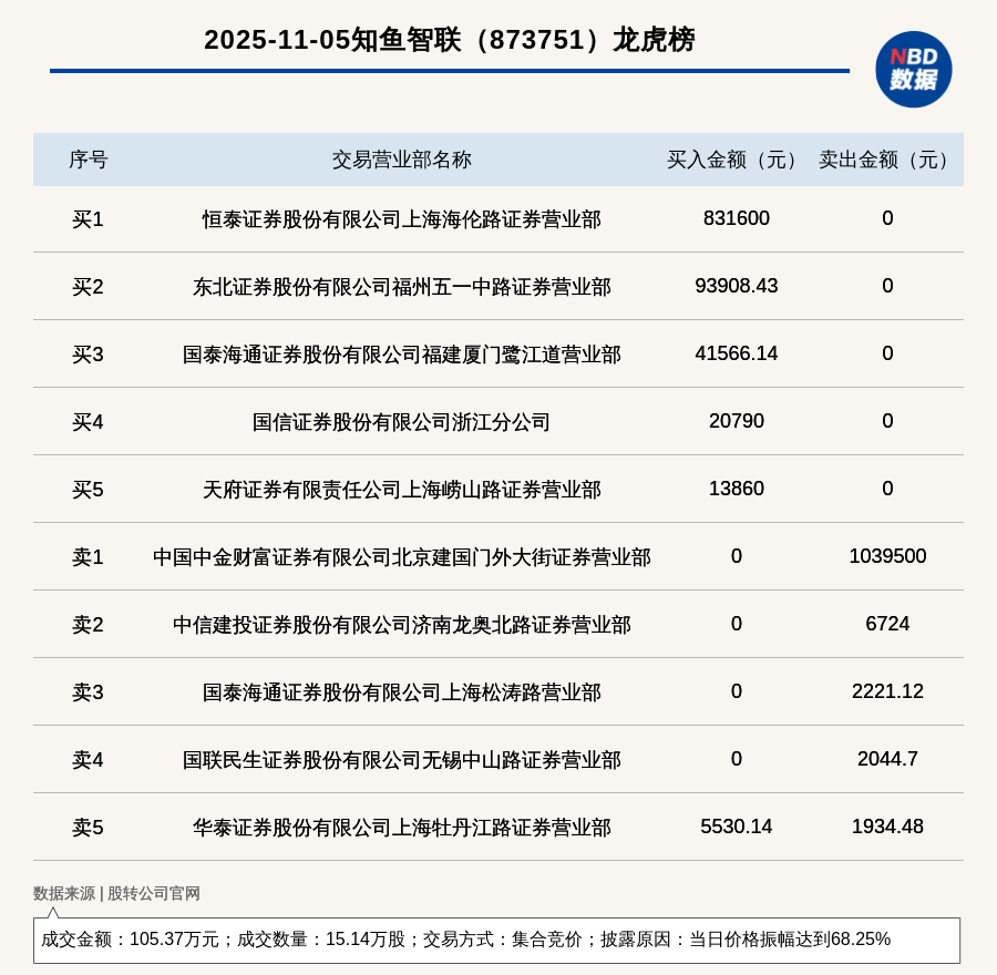 每經訊,2025年11月5日,新三板創新層公司知魚智聯(873751,收盤價:10.3元)登上龍虎榜,交易方式是集合競價,披露原因是當日價格振幅達到68.25%,成交數量15.14萬股,成交金額105.37萬元。買一席位為恒泰證券股份有限公司上海海倫路證券營業部,買入83.16萬元;賣一席位為中國中金財富證券有限公司北京建國門外大街證券營業部,賣出103.95萬元。