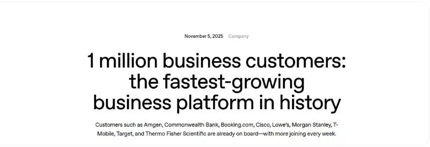 OpenAI稱,隨著ChatGPT每周活躍用戶超過8億人,消費市場的廣泛接受也推動企業采納AI——企業試用周期正變得越來越短、部署阻力越來越小。