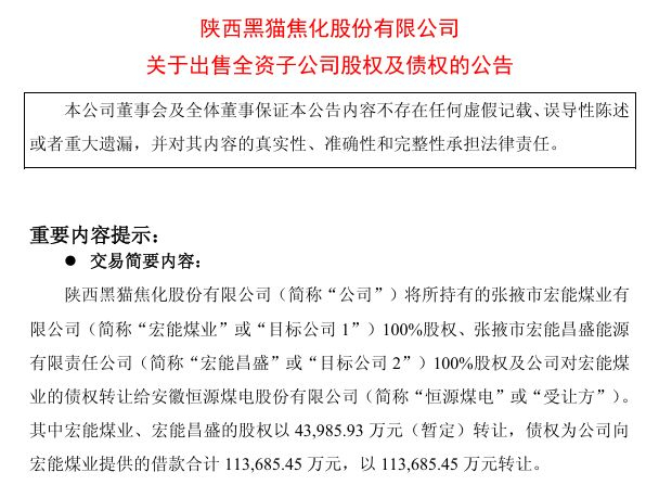 11月5日晚間,陜西黑貓(601015.SH)公告稱,將所持有的張掖市宏能煤業有限公司(簡稱:宏能煤業)100%股權、張掖市宏能昌盛能源有限責任公司(簡稱:宏能昌盛)100%股權以及對宏能煤業的債權,一并轉讓給恒源煤電(600971.SH)。