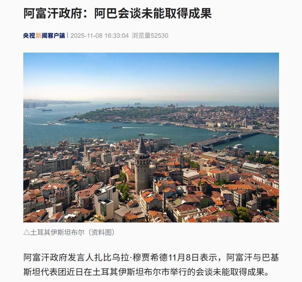 阿富汗政府發言人11月8日稱,阿富汗與巴基斯坦代表團近日在伊斯坦布爾的會談未取得成果,因巴方試圖推卸安全責任且無合作態度。巴國防部長7日表示,會談無限期擱置,因阿方不愿簽書面協議。巴阿邊境近期多次交火,10月卡塔爾和土耳其曾斡旋雙方停火并繼續會談,但未達成可行方案,新一輪會談首日邊境又起交火。