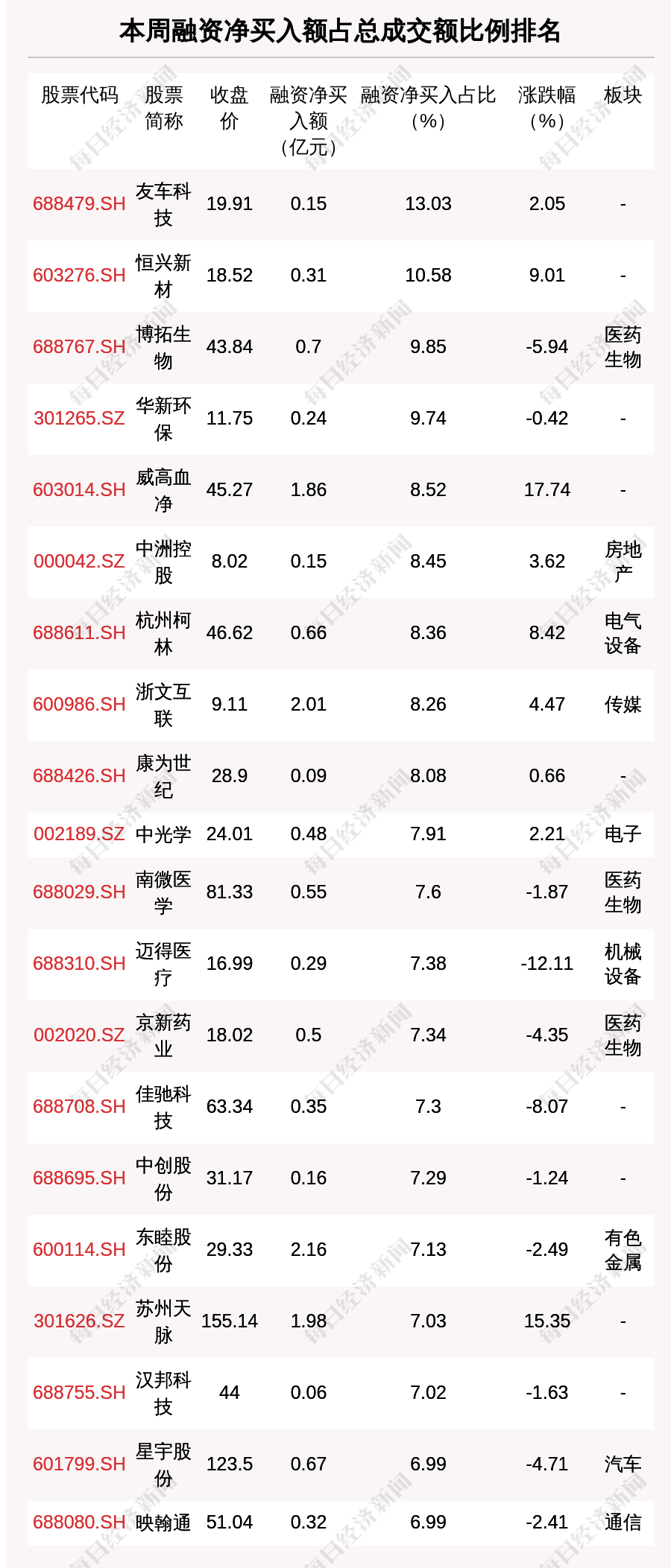 兩市共有2只股票融資凈買入額占總成交金額比例超10%,其中友車科技、恒興新材、博拓生物排名前三,占比分別為13.03%、10.58%、9.85%。