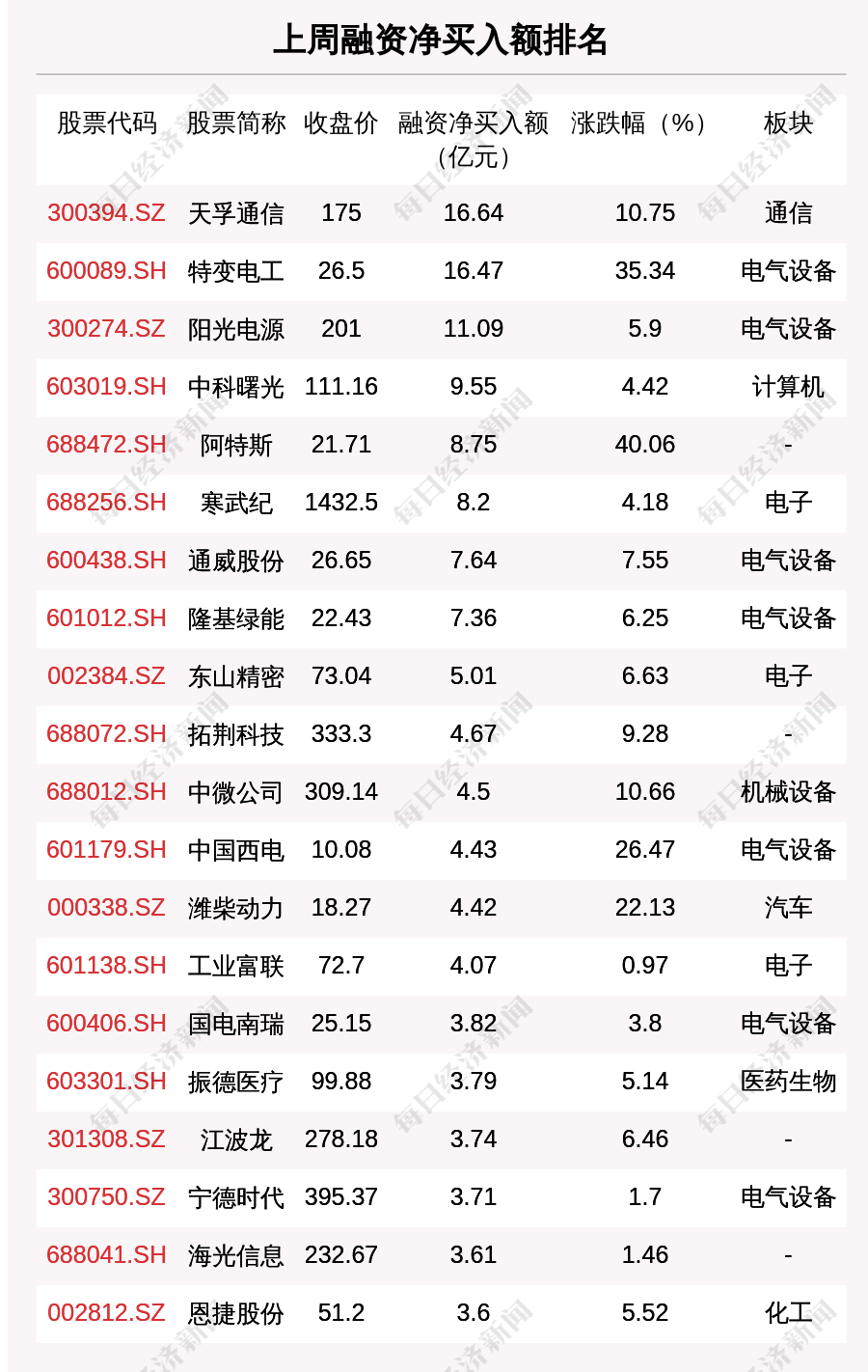 上周兩市共有1641只個股有融資資金凈買入,共有3只個股凈買入金額超10億元,其中天孚通信、特變電工、陽光電源排名前三,買入金額分別為16.64億元、16.47億元、11.09億元。