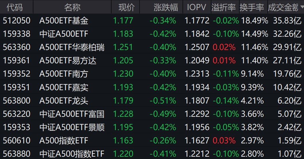 截至上午收盤,場內跟蹤中證A500指數的ETF小幅下跌。其中,有11只中證A500相關ETF成交額超1億元,3只超29億元。A500ETF基金、中證A500ETF、A500ETF華泰柏瑞早盤成交額分別為35.83億元、32.26億元、29.91億元。