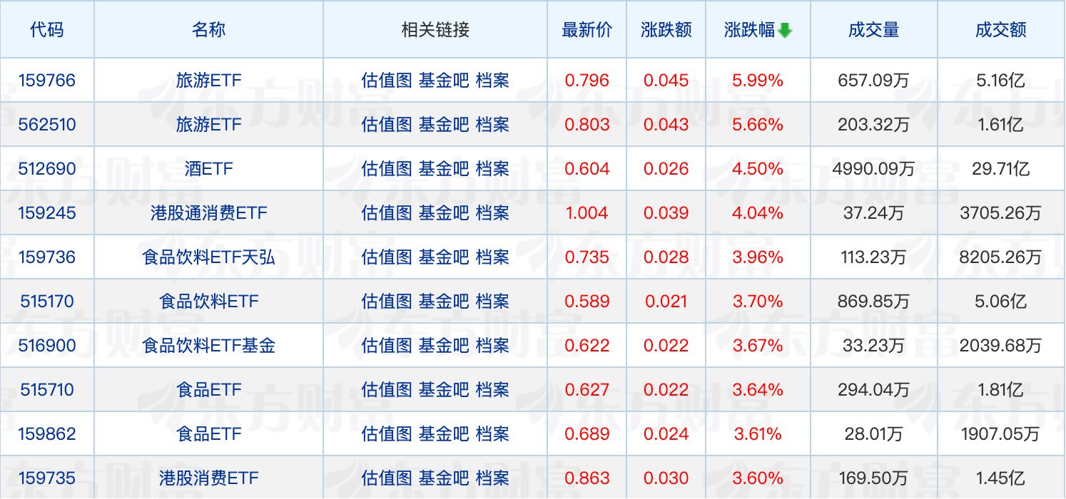 具體來看,兩只旅游ETF漲幅均超過5%。大消費板塊爆發,食品飲料方向領漲,酒ETF、食品飲料ETF集體走強。