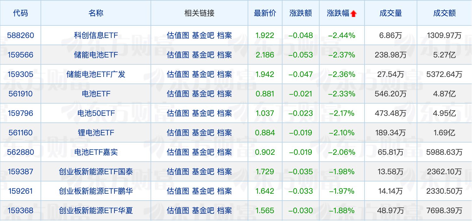 下跌方面,科創信息ETF領跌2.44%,電池相關ETF全線回調。