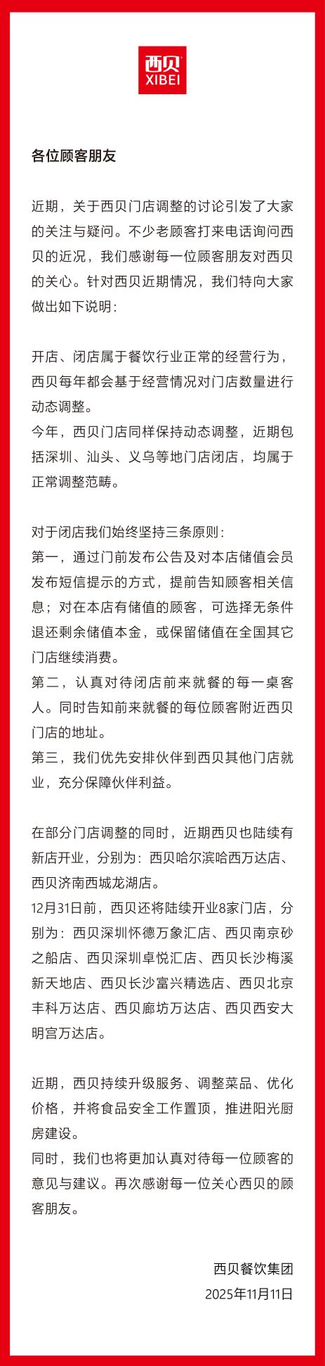 11月11日,針對近期“西貝閉店潮”相關報道及不實傳聞,西貝發布官方聲明回應近況表示:西貝近期持續升級服務、調整菜品、優化價格,年內還將開店8家,部分門店閉店情況屬于正常動態調整。