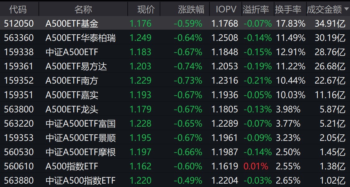 截至上午收盤,場內跟蹤中證A500指數的ETF小幅下跌。其中,有12只中證A500相關ETF成交額超1億元,3只超28億元。A500ETF基金、A500ETF華泰柏瑞、中證A500ETF早盤成交額分別為34.91億元、30.19億元、28.76億元。