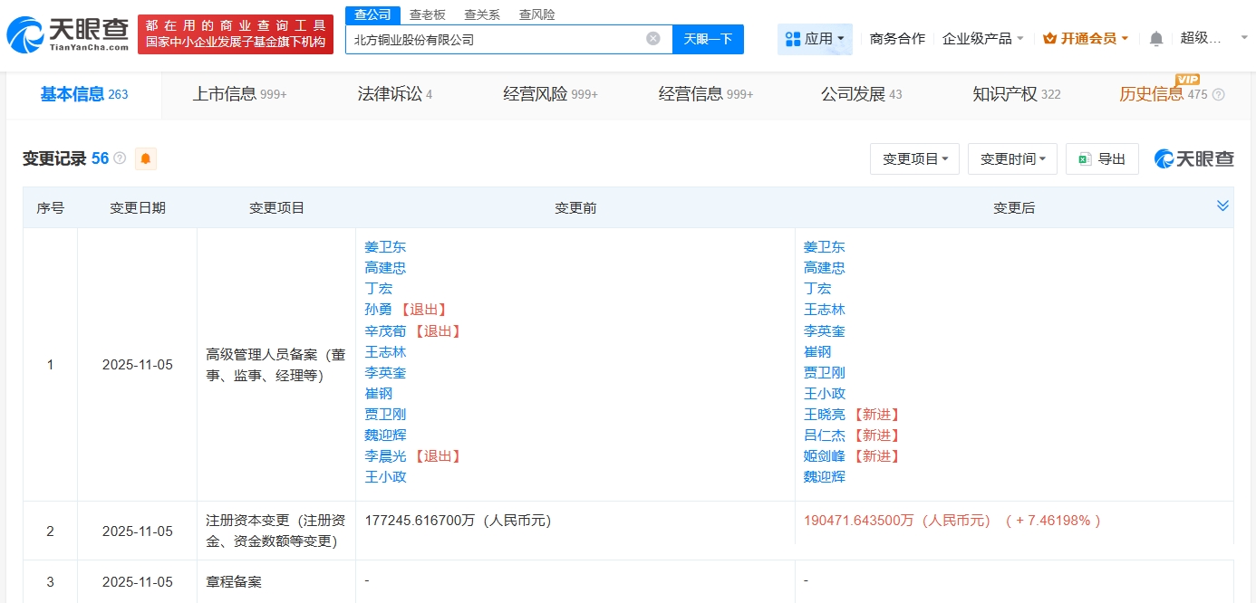每經AI快訊,天眼查工商信息顯示,近日,北方銅業(000737)發生工商變更,注冊資本由約17.72億元人民幣增至約19.05億元人民幣,增幅約7.46%,同時部分高管發生變更。北方銅業股份有限公司成立于1996年4月,法定代表人為魏迎輝,經營范圍含非煤礦山礦產資源開采、金屬礦石銷售、常用有色金屬冶煉等。股東信息顯示,該公司由中條山有色金屬集團有限公司、山西焦煤運城鹽化集團有限責任公司、晉創投資有限公司等共同持股。