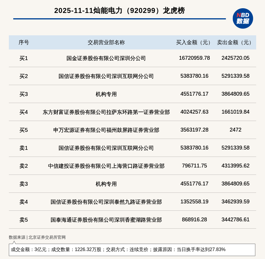 每經訊,2025年11月11日,北交所上市公司燦能電力(920299,收盤價:24.05元)登上龍虎榜,交易方式是連續競價,披露原因是當日換手率達到27.83%,成交數量1226.32萬股,成交金額3億元。買一席位為國金證券股份有限公司深圳分公司,買入1672.1萬元;賣一席位為國信證券股份有限公司深圳互聯網分公司,賣出529.13萬元。