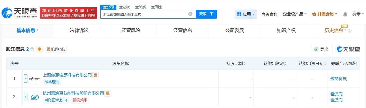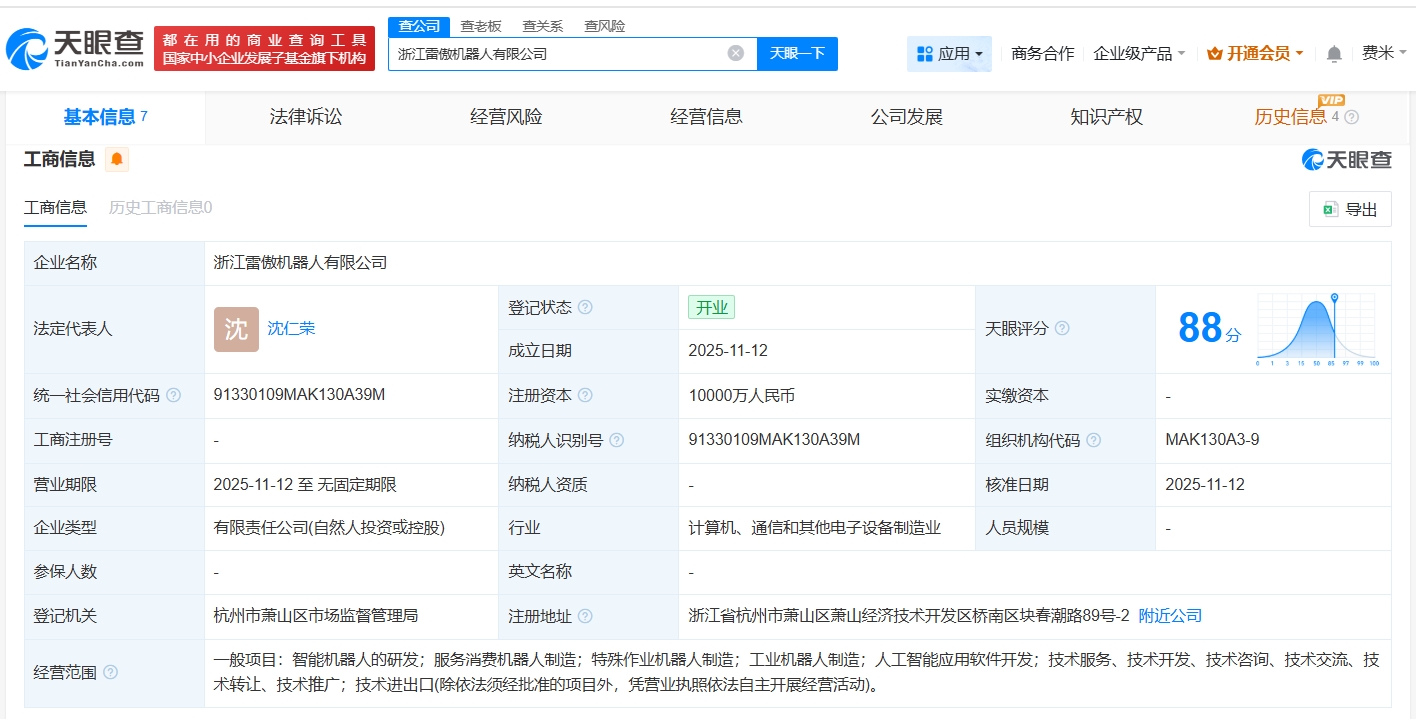 每經AI快訊,天眼查工商信息顯示,近日,浙江雷傲機器人有限公司成立,法定代表人為沈仁榮,注冊資本1億元人民幣,經營范圍包括智能機器人的研發、服務消費機器人制造、特殊作業機器人制造等。股東信息顯示,該公司由上海傲意信息科技有限公司、雷迪克(300652)共同持股。